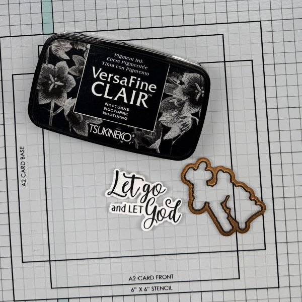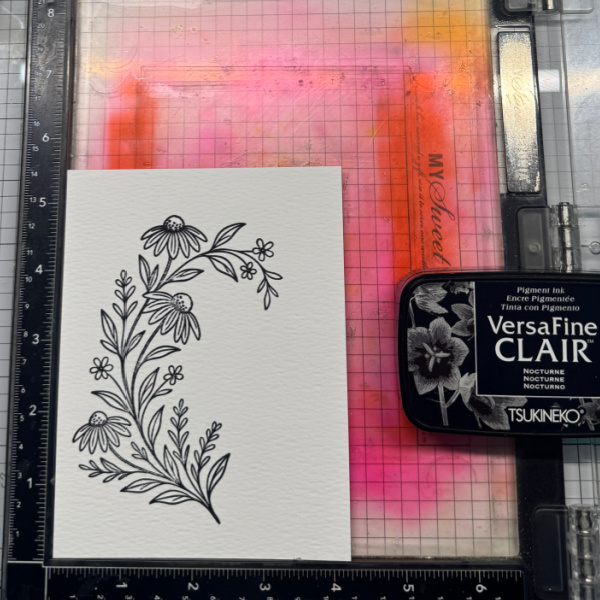 Step 1: Stamp the main floral stamp on a piece of watercolor paper with Nocturne VersaFine Clair ink. Heat emboss with clear embossing powder. Then die cut the image with a mid-sized background panel die