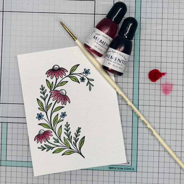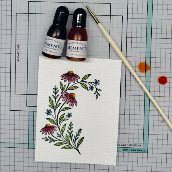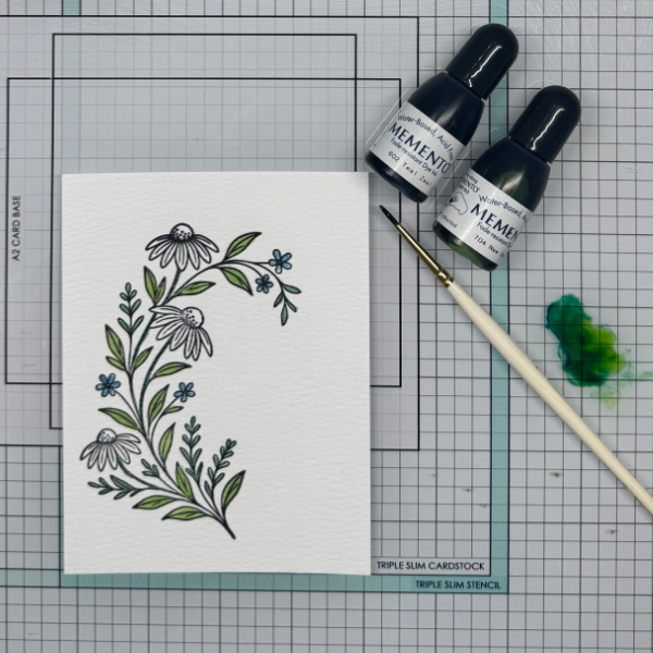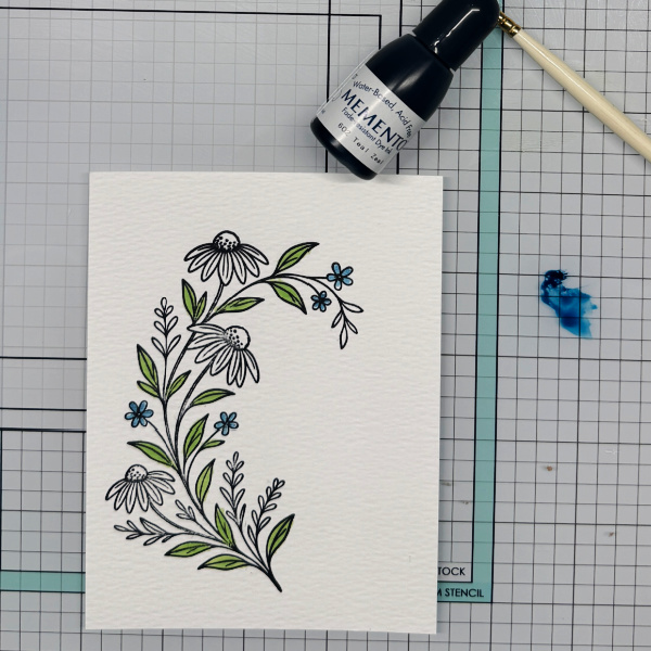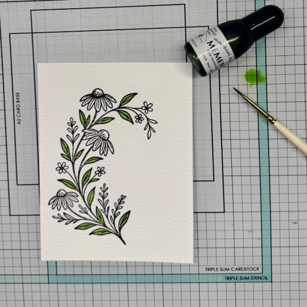 Step 2: Using a green re-inker paint the leaves on the floral image.