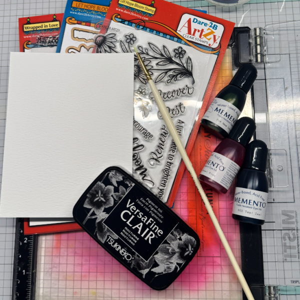 Gather your supplies. You will need a floral image stamp or a line image that you can color, several colors of water based re-inkers to watercolor with, small paintbrush, water friendly paper and a pigment ink.