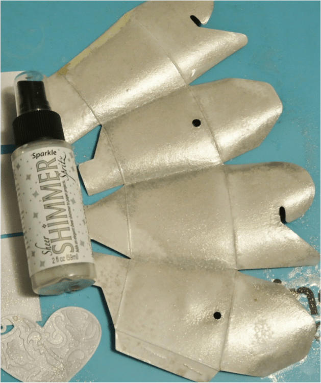 Die cut card base, matching panels and filigree hearts from plain white cardstock. Mist the card, panels, and heart with Sheer Shimmer Spritz in Sparkle and let dry naturally.