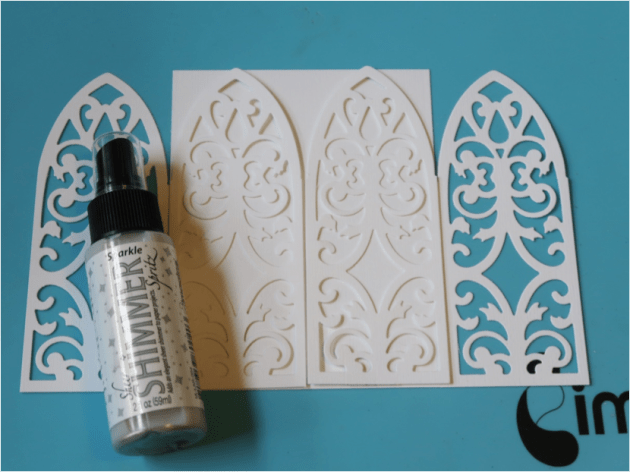 Die cut filigree design on a strip of cardstock. Spritz the die cut strips with Sparkle Sheer Shimmer Spritz.