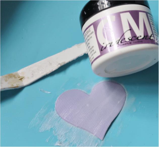 Spread an even layer of Iridescent Purple Creative Medium over the heart using a palette knife. At this time, spread a layer of the Purple Creative Medium over a large piece of black cardstock and set both aside to dry.