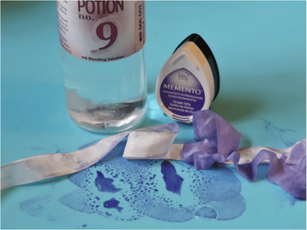 Pounce Grape Jelly Memento Ink on the craft mat, spritz with Ink Potion No. 9, scrunch up a length of white rayon seam binding and dab it in the ink mixture. Set aside to dry.