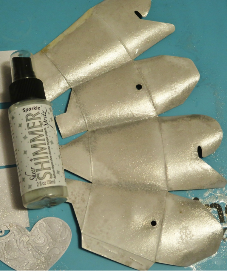 Die cut card base, matching panels and filigree hearts from plain white cardstock. Mist the card, panels, and heart with Sheer Shimmer Spritz in Sparkle and let dry naturally.