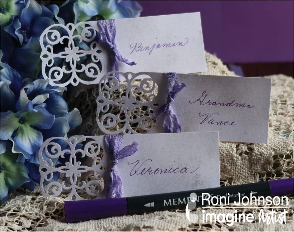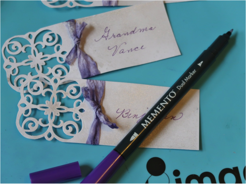 Tie a piece of the dyed seam binding around each place card. Cut a piece of scrap cardstock 1×2 inch and fold in half to form a small tent. Adhere the tent to the back of the place card.Write each person’s name on the place cards using Grape Jelly Memento Dual Tip Marker.