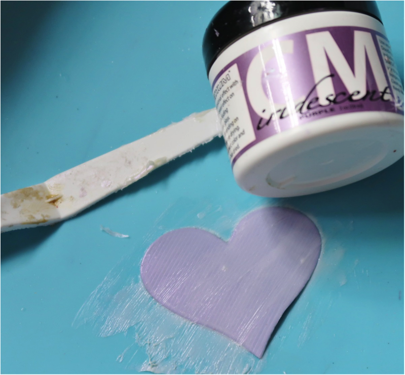 Spread an even layer of Iridescent Purple Creative Medium over the heart using a palette knife. At this time, spread a layer of the Purple Creative Medium over a large piece of black cardstock and set both aside to dry.