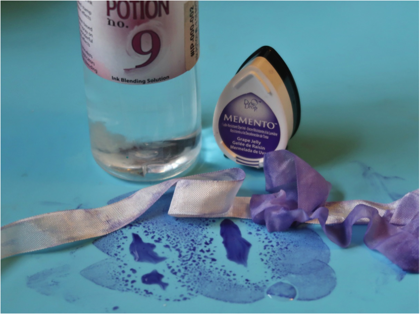 Pounce Grape Jelly Memento Ink on the craft mat, spritz with Ink Potion No. 9, scrunch up a length of white rayon seam binding and dab it in the ink mixture. Set aside to dry.
