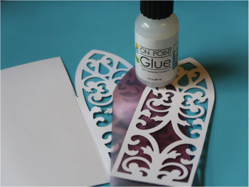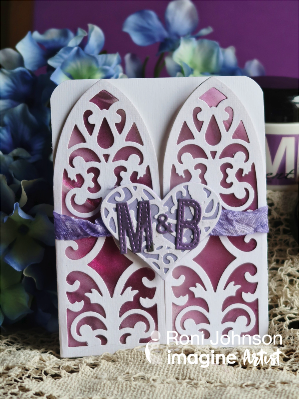 Once all of the elements have dried trim two pieces of the Vertigo Film to the size of the filigree flaps. Adhere the Vertigo Film to the card using On Point Glue sandwiching the film between the card flap and extra filigree screen. Adhere the Sparkle filigree heart to the lavender heart using On Point Glue. Die cut letters and “&” sign from the black Creative Medium covered cardstock and adhere to the center of the heart.