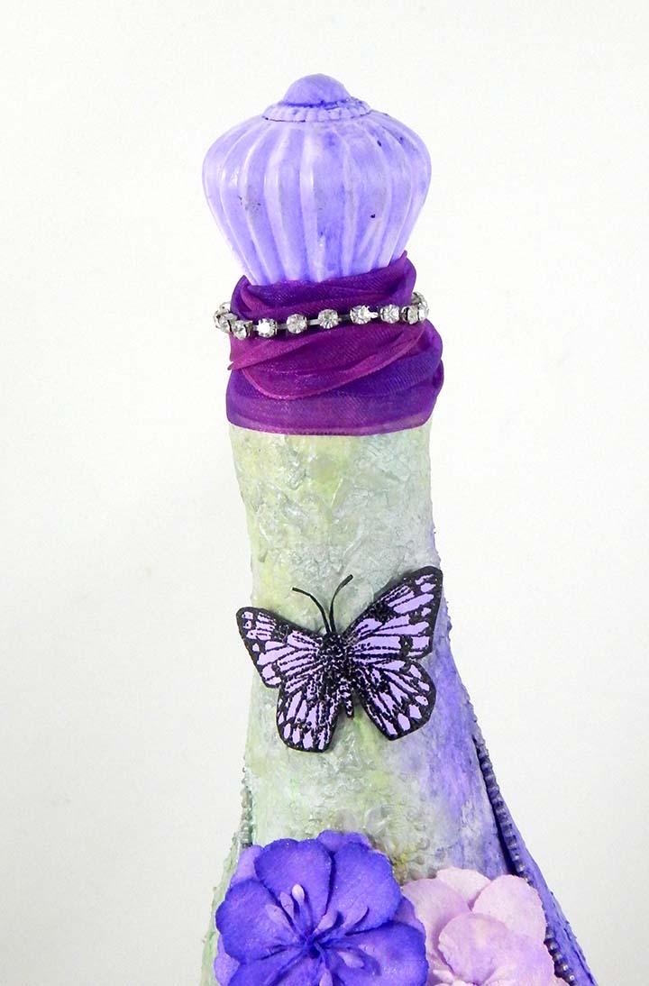 Phew! Almost done. All that is left to do is to put it together. Glue the flowers in the area between the open zipper, tucking them under the edges. Glue butterflies around. Spray a little bit of sealer over the entire bottle.