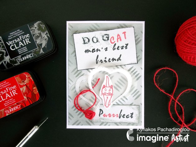 It’s time for someone to take charge and change the “myth” and set things straight! That was what the cat was thinking and decided to scratch out the dog in man’s best friend and replace it with the right word! Celebrate cats with your cat-loving friends by making this high contrast purrrfect card. Black and red stamping in contrast with the white card and gray distressed background enhance the bold dimensional design. Add a cute kitty stamp front and center with a little ball of string for her to bat around as adorable final touches.