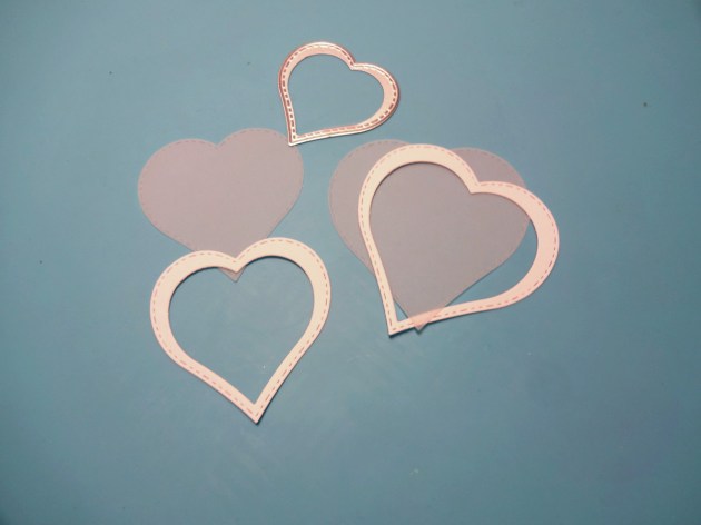 Die cut hearts frames from watercolor paper and full hearts from tracing paper.