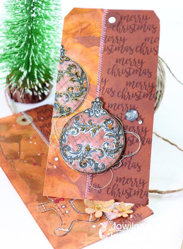 Adhere the paper strip down the left side of the tag and add decorative sewing. Adhere the colored baubles (ornaments) using foam tape for dimension. Adhere one bauble (ornament) flat and cut off overlapping side. Add diamanté and other flourishes to finish it up.
