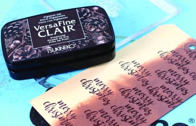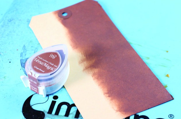 Once the texture paste is dry, use VersaMagic Gingerbread and color the entire piece of cardstock. Blend the ink over the texture paste, then cut a strip about 3cm wide and the length of you tag.