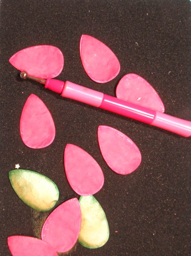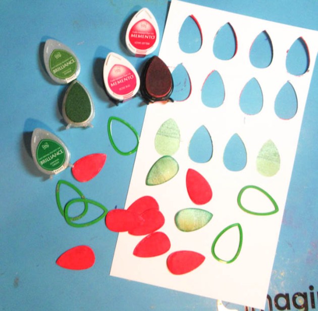 Stamp each stamp pad onto white cardstock. Punch out the petals by using the Dewlet dies and a die cut machine.