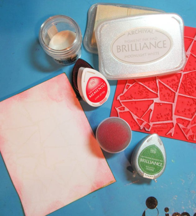 Create the background by inking a large background stamp with white ink then emboss with clear embossing powder to create a tone-on-tone effect. Using a jumbo dauber, ink around the panel with Memento in Love Letter, then edge with Brilliance in Thyme.