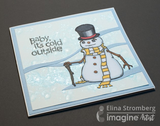 Stamp and color the snowman image on white paper. When coloring with alcohol markers (like Promarkers, Copics), use water-based ink for stamping. Memento Tuxedo Black is my No. #1 choice for the task!