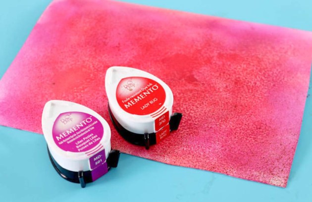 Use the direct-to-paper method and ink the remainder of the pane using Lady Bug and Lilac Posies Memento DewDrop inkpads.