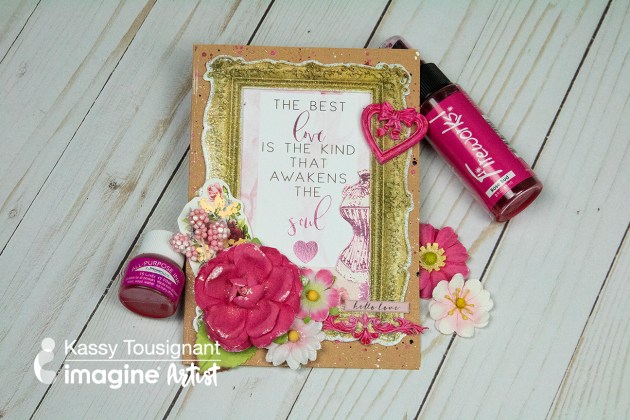 I just love using Imagine products with different finishes and textures together in a mixed media card. The background of this Valentine card has shimmer from the Fireworks spray, dimension from the irRESISTible Pico Embellisher, and shine like no other from the Goosebumps spray! Also, All Purpose Ink is fantastic for use on resin or clay shapes. You can paint or spray it on for really great coverage. The sparkle and shine from the embossing powder really makes the paper frame stand out!