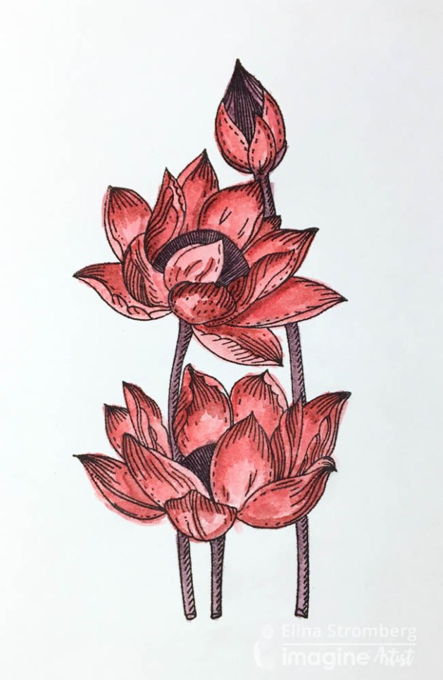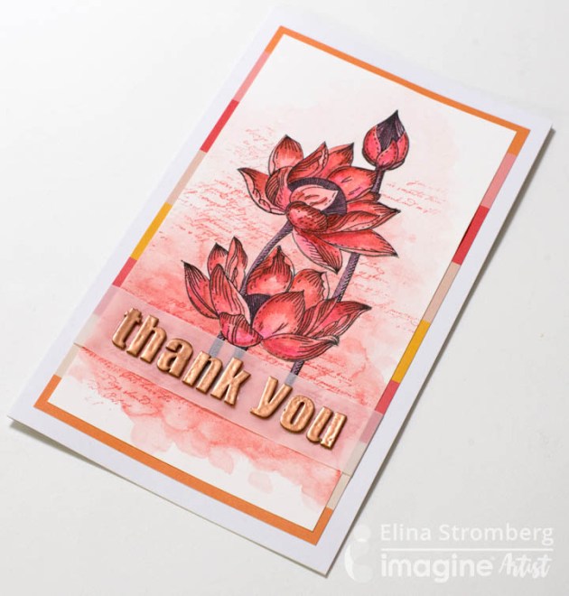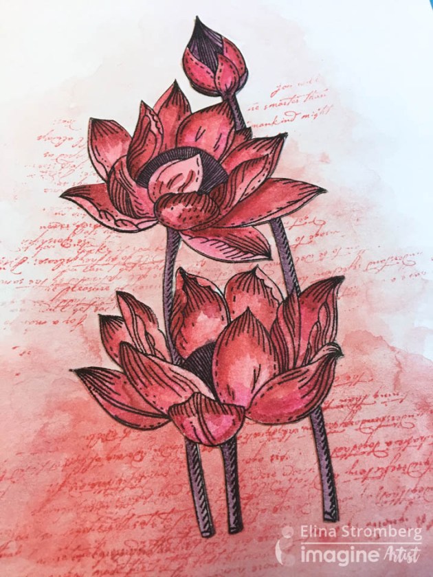 Tsukineko ink pads come in several beautiful red colors, so I chose a few of my favorite reds and used them both for coloring the card background and for painting the beautiful Penny Black flower image. The trick was to stamp the main image twice and to layer the fuzzy-cut image on top of the stamped background; by using this technique the main image on the finished card has a beautiful, crispy edge, and while painting you don’t need to worry about the wet color running over the stamped lines!
