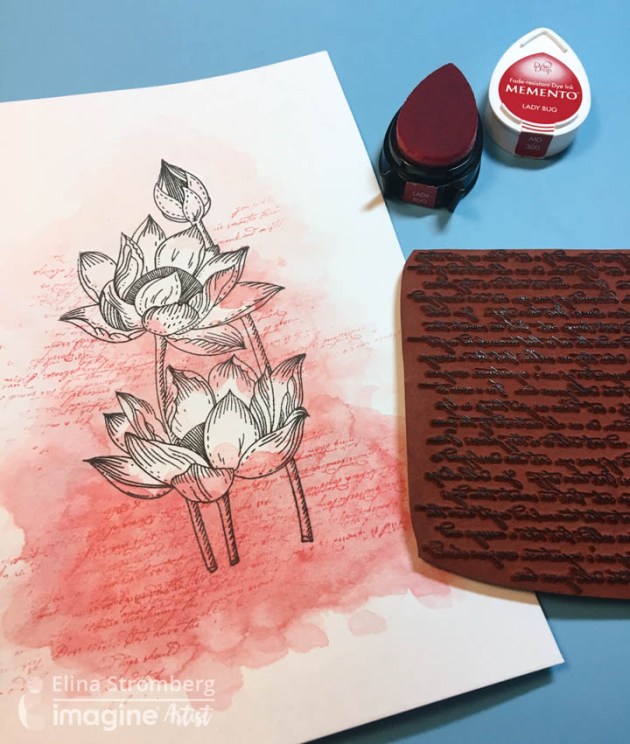 Add texture to the painted background. Stamp random patterns here and there using red ‘Lady Bug’ Memento color. Keep the stamp in your hand (do not attach to an acrylic stamping block) and bend it while stamping.