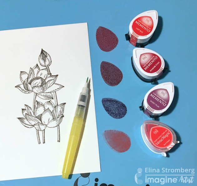 Re-stamp the main flower image on another sheet of white mixed media paper. Color the image using a water brush and a few hues of red ink. I used Memento ‘Lady Bug’, bit darker red ‘Rhubarb Stalk’, dark purple ‘Sweet Plum’, and VersaMagic ‘Red Magic’ for coloring the background. Use the Craft Mat as your palette and apply more ink if needed. Once dry, cut out the image.
