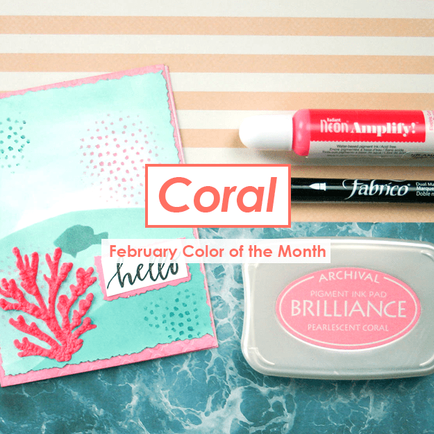 The Color of the Month for February is Coral. We see coral as a beautiful pink-orange that can have a hue range from vibrant colors found in Radiant Neon product line with the full-size Electric Coral inkpad, Amplify Texture in Electric Coral to softer colors like Fabrico markers such as Apricot, Brilliance Pearlescent Coral, and VersaColor Seashell. These colors are a great addition to your crafting ink collection.