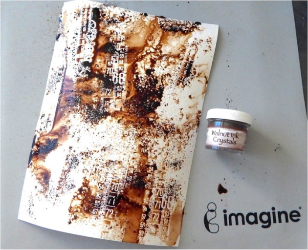 Techniques for varying the look of the Walnut Ink Crystals. Leave crystals as is, spray more water on some areas, for a watercolored look-paint with a brush, hold the paper up and spray water on the top of the paper and allow the ink to drip down. Allow the paper to completely dry.