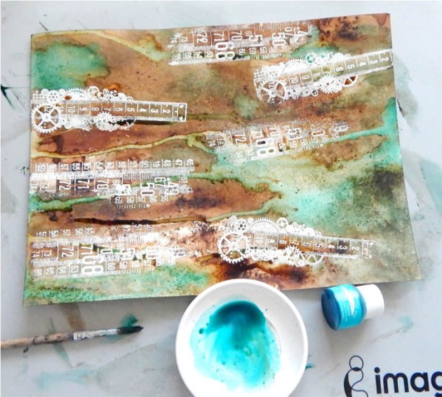 Add a different, but contrasting color. Place a few drops of Tropical Lagoon All-Purpose Ink on your surface, spray a little water into the ink. Brush the ink in random areas. Spray water and allow the ink to drip. Allow the paper to completely dry.