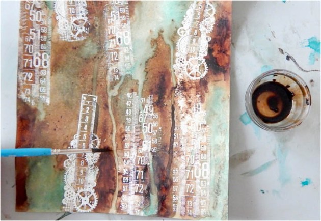 Begin by stamping and embossing with Imagine’s white embossing powder. I was going for a theme of rulers and flowers, denoting growing and blooming.