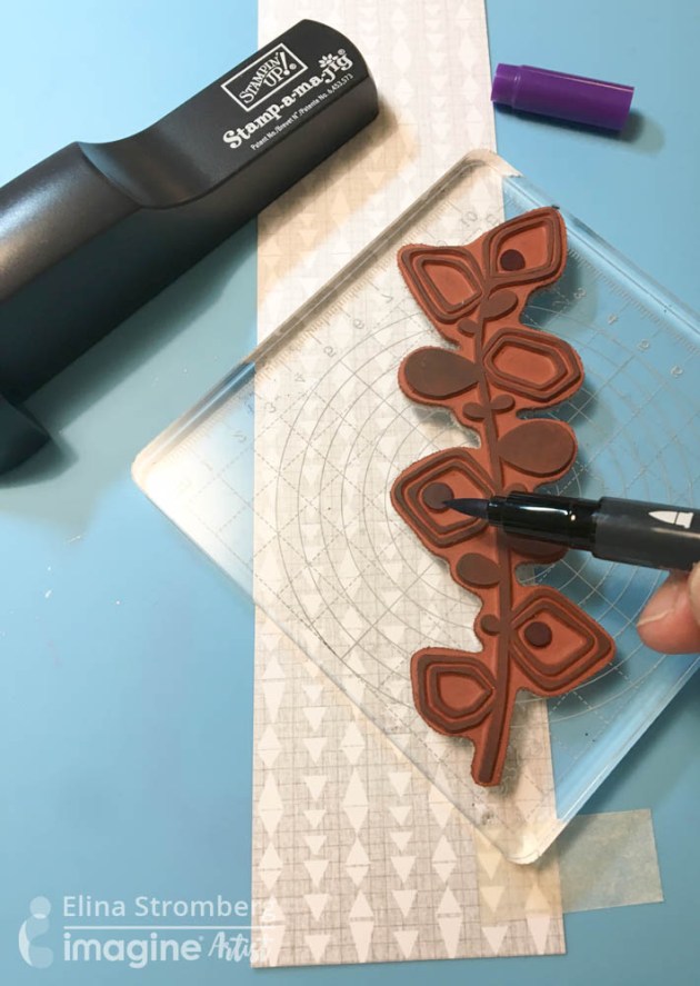 Trim a strip of light patterned paper, and secure on crafting mat with a few pieces of masking tape. Attach stamp on an acrylic stamping block, turn upside down with the stamp facing the paper. Center stamp on the paper strip, and position stamping tool accordingly. Leaving stamping tool in place, turn the stamping block around. Color a few details of the stamp with Memento markers. Stamp colored details on a paper strip and leave stamping tool in place.
