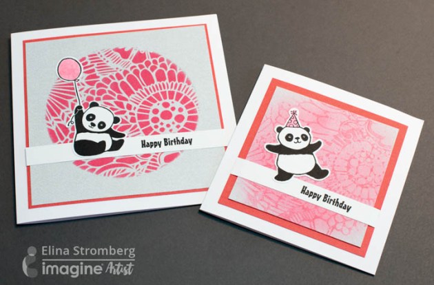 Then I removed the stencil, let the ink dry, and dabbed a thin layer of coral ink on the pattern. Then I repeated the mounting on coral cardstock and used a different panda image for this card. I think this reverse version of the stencil pattern looks very nice, too!