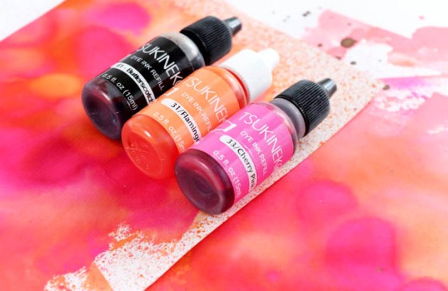 Add a few drops of dye ink refill ink onto watercolor paper and mist with water. Keep adding drops of ink and mist with water until you are happy with the look.
