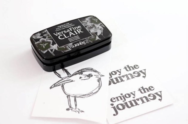 Stamp birds and sentiment onto smooth white cardstock using VersaFine Clair Nocturne ink.