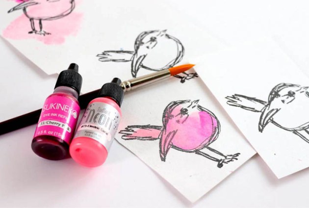 Add a few drops of re-inker ink onto your craft mat. Mist water next to the ink. Pick up a small amount of water and mix with the ink and then paint your bird images.