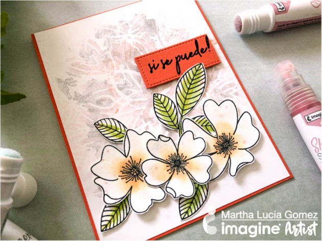 Finally, I fussy cut my flowers and leaves with my scissors, resized the stenciled layer and pasted it directly over the card base. Then, I arranged and pasted the flowers on the lower part of the card. I completed this look adding a shimmering touch to the petals of the flowers with the Dauber Top of Frost Sheer Shimmer Stix and stamped the sentiment over a banner calypso coral with VersaFine Clair Nocturne. I used a Spanish Sentiment included on the new stamp set Sueña Alto from RG Studio 360. I am fascinated with the performance of the new Sheer Shimmer Stix Dauber Tops, you can keep the control of the color, you can mix tones and you can add just in the place that you want!