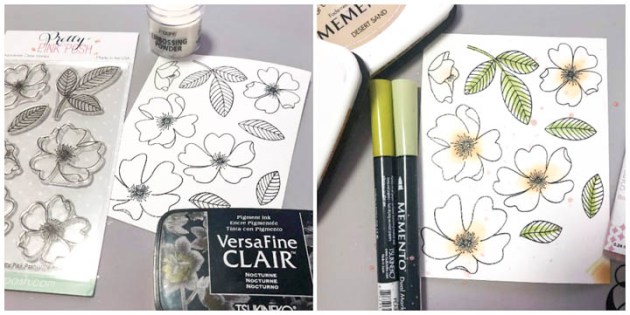 In a separate piece of whisper white card stock, I stamped flowers and leaves from the stamp set Wild Rose from Pretty Pink Posh with VersaFine Clair Nocturne and embossed with clear embossing powder. Next, I colored the center of the flowers with a dauber using two different colors of Memento Ink, Desert Sand and Peanut Brittle. For the leaves, I used two different greens of Memento Markers, Pear Tart and New Sprout. Next, I splattered the entire stamped piece with Sheer Shimmer Spritz Rose Gold using the spray tube to splatter the drops.