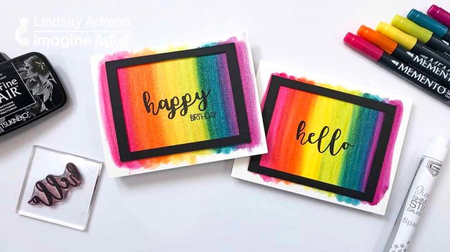 I LOVE anything and everything rainbow in cardmaking, and if it sparkles, that’s even better! Making a rainbow watercolor background is pretty simple, but adding a good amount of sparkle without making mud can be more tricky. The Shimmer Stix are the PERFECT applicator to make a fun background that keeps its bright and vibrant colors without sacrificing any of the sparkle! I was so excited that the Shimmer Stix worked for this technique and can’t wait to try them with an ombre background, next!! I made two cards today, a birthday and hello card, plus check out the inside, too!!