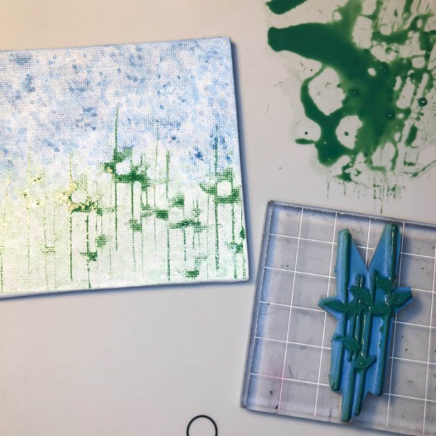 Place Celedon ink onto craft mat, ink stamp, & stamp stems onto the lower portion of the canvas.