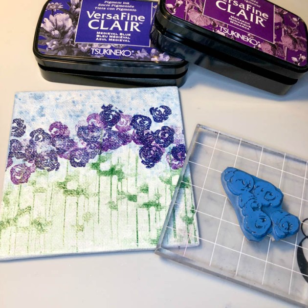 Stamp roses with VersaFine Clair in Medieval Blue & Monarch across canvas above the stems.