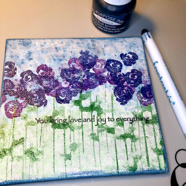 Stamp saying with VersaFine Nocturne onto the canvas.