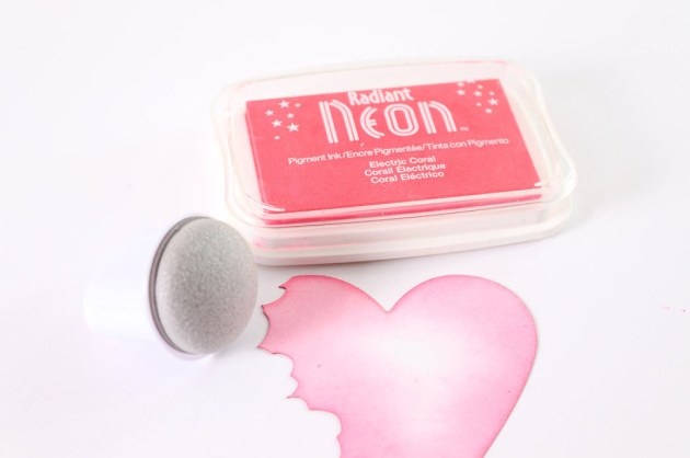 Use a pre-cut heart or download the cut file from the link in the products list below and cut with a Cricut machine. Create the die-cut heart and take it apart. Use a jumbo dauber and blend Radiant Neon Coral around the outside edges.