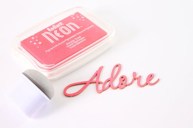 Ink a chipboard sentiment using Radiant Neon Coral ink pad.