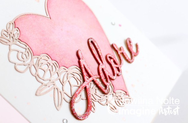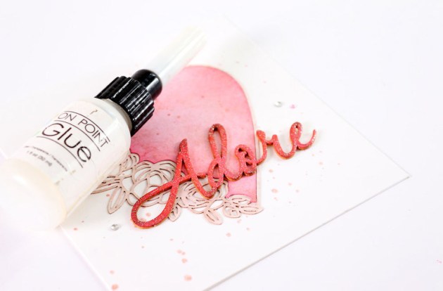 Ink the chipboard sentiment with VersaMark ink pad and sprinkle with glitter embossing powder. Heat the powder until fully melted with your heat gun. Use On Point Glue to adhere the outside and the inner of the die-cut heart to the front of your folded card.