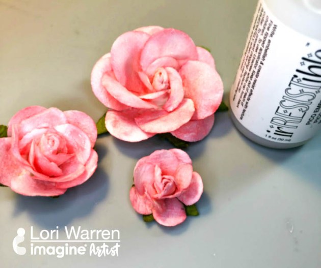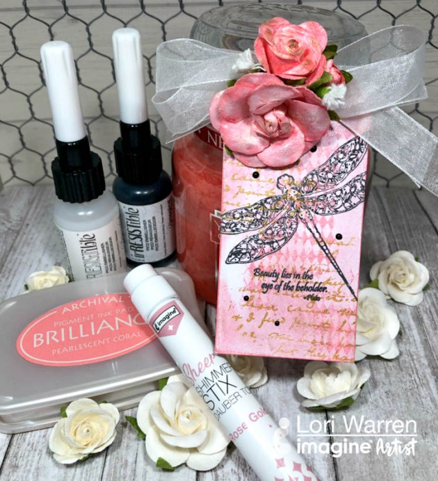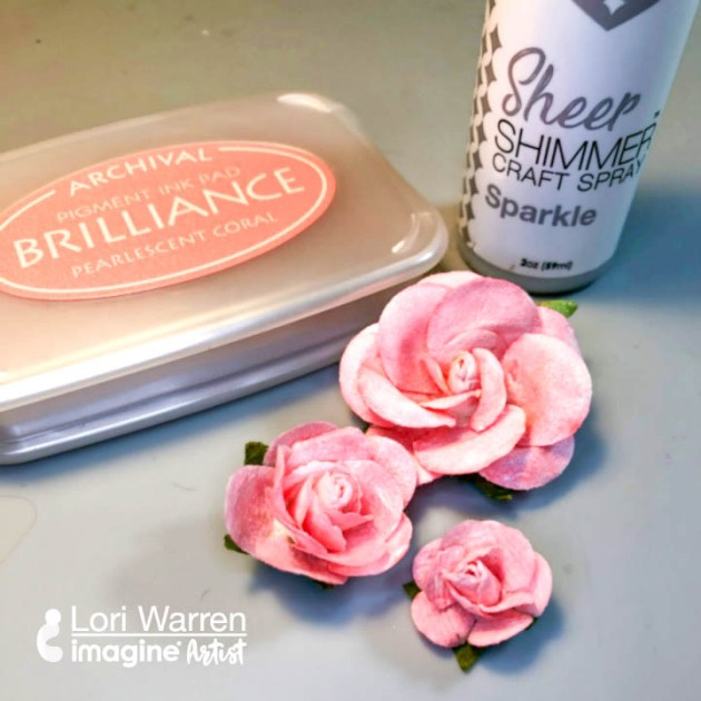 I have limited space for craft supplies and am always looking for ways to get multiple uses out of a single supply. One way to accomplish this, for example, is to keep a stash of white paper flowers in different sizes and color them to match your project. This way, you don’t have to make room for multiple packages of pre-colored flowers. See how I create a Rose Gold Dragonfly theme gift tag using several of Imagine and Tsukineko inks.