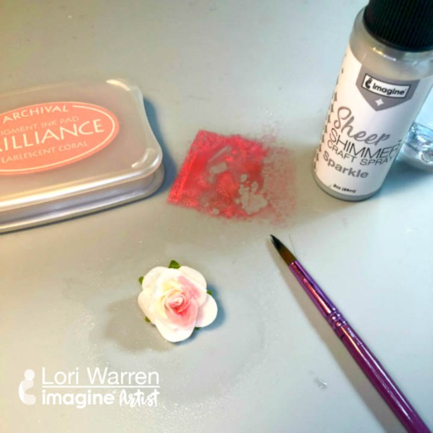 Apply Brilliance Ink to mat, add Shimmer Spray, use to color paper flower. Allow to dry.
