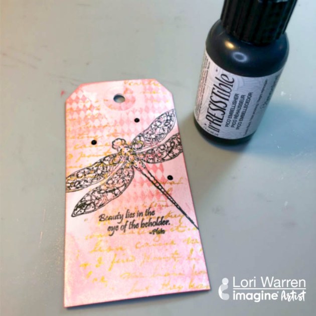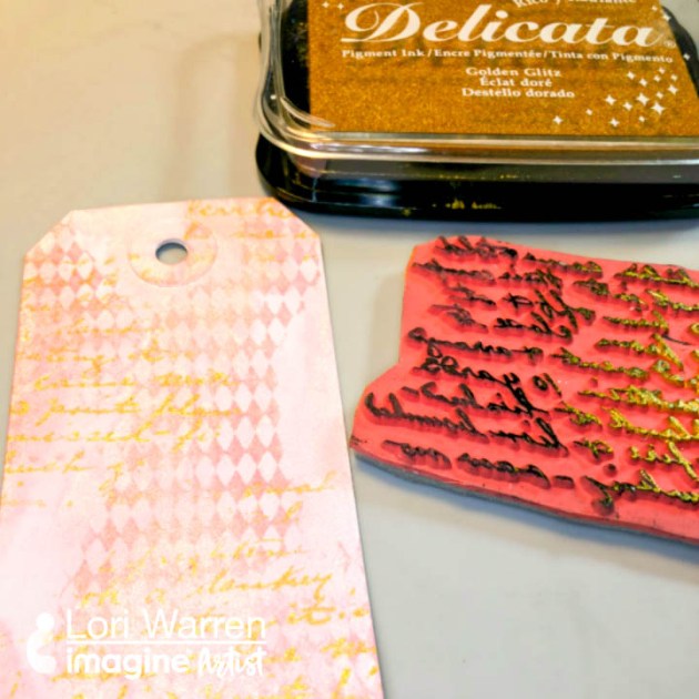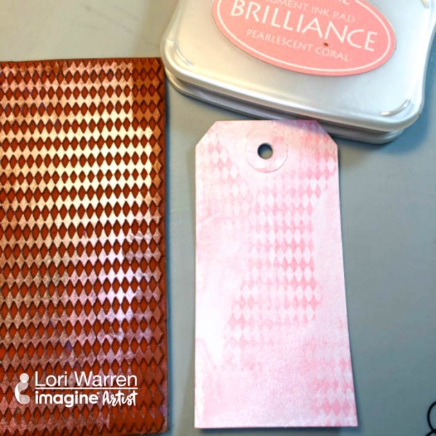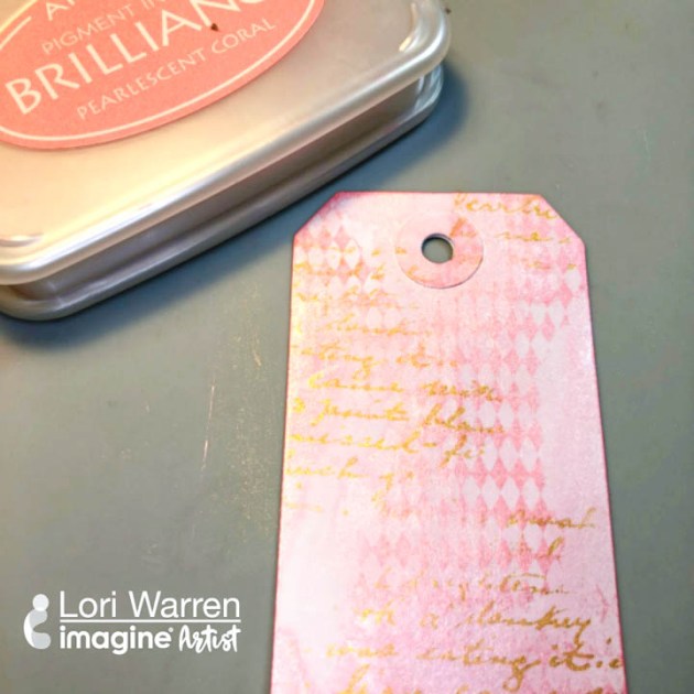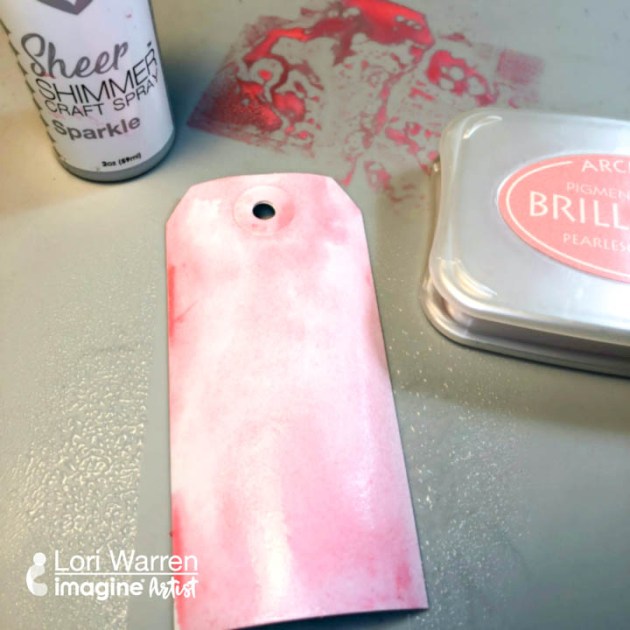 Apply Brilliance Ink in Pearlescent Coral to the mat, add Shimmer Spray and lay tag down into wet ink. Allow to dry.