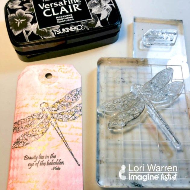Stamp Dragonfly image and saying with VersaFine CLAIR in Nocturne.
