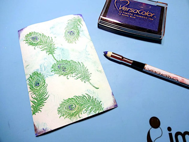 Use a BrushStix to add color detail at the corners of the paper and the in the center of the peacock feathers with the VersaColor Royal Blue inkpad.