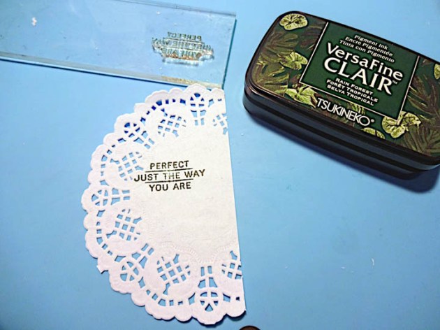 Cut a paper doily and stamp with the quote “Perfect Just the Way You Are” with the VersaFine Clair in Rain Forest.