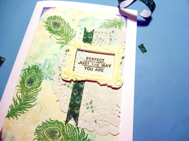Place the peacock ribbon first. Cut it in half to give the illusion it is under the frame. Attach the frame to the card face then place the sentiment inside the frame.